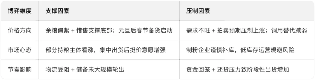2. 小麦替代预期:市场预计2026年1月7日启动最低收购价小麦拍卖(每期约20万吨),流向饲用渠道,替代玉米需求,限制上涨空间。