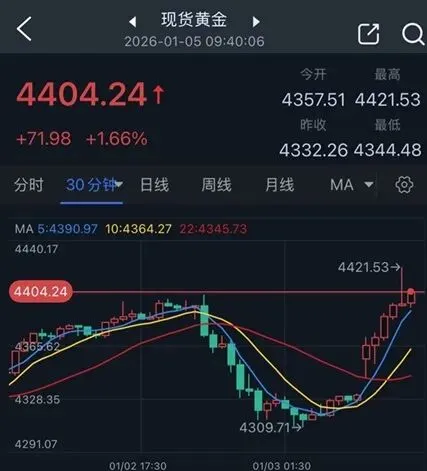 周一(1月5日)亚市盘中,现货黄金持续大幅攀升,金价已经突破4400美元/盎司大关。美国总统特朗普(Donald Trump)最新警告称,委内瑞拉“后马杜罗时代”的领导人必须遵守相关条件,否则将付出“非常沉重的代价”。