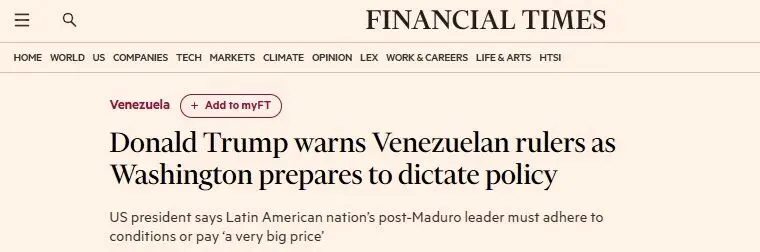 英国《金融时报》报道称,特朗普向委内瑞拉目前事实上的领导人德尔西·罗德里格斯(Delcy Rodríguez)发出了严厉警告,称在尼古拉斯·马杜罗被捕之后,她必须满足美国的要求。与此同时,华盛顿释放信号,表明其意图是在加拉加斯“定调”政策,而不是对该国进行实际治理。