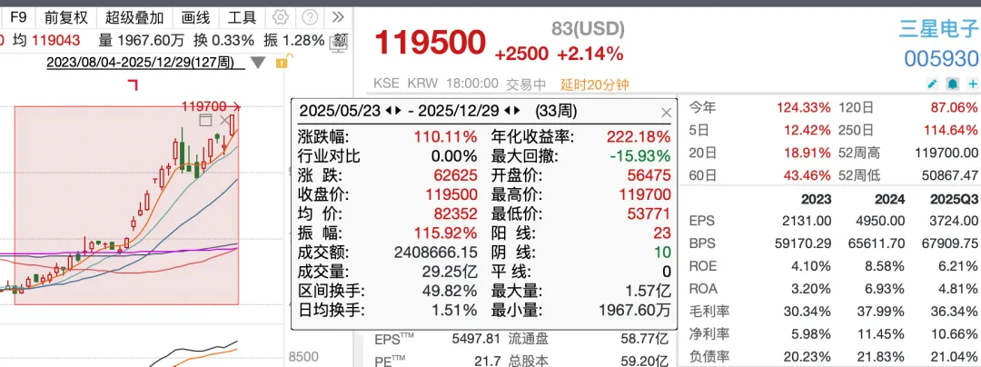 受此利好影响,野村(12月24日)重申了对三星电子和SK海力士的“买入”评级。野村将三星电子的目标价上调6.7%至16万韩元,将SK海力士的目标价上调4.8%至88万韩元,认为两家公司的估值相较于行业同行仍具吸引力,且随着盈利能力的显著改善,股价仍有约45%-50%的上涨空间。