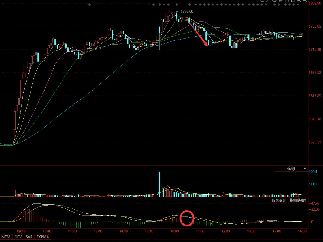 昨天给的是5800,可以减仓,赔率角度考虑,这是一个很好的T的机会,今天最高5786触发5分钟顶背,就被一路砸下来了,比较理想的T的点位就是如下,次高到一个支撑位: