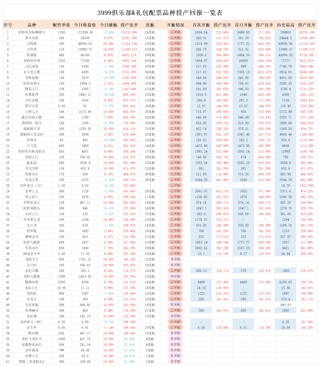 1.5日收盘价已更新。《3999俱乐部&礼包配票品种投产回报一览表》大家可以自行查看。