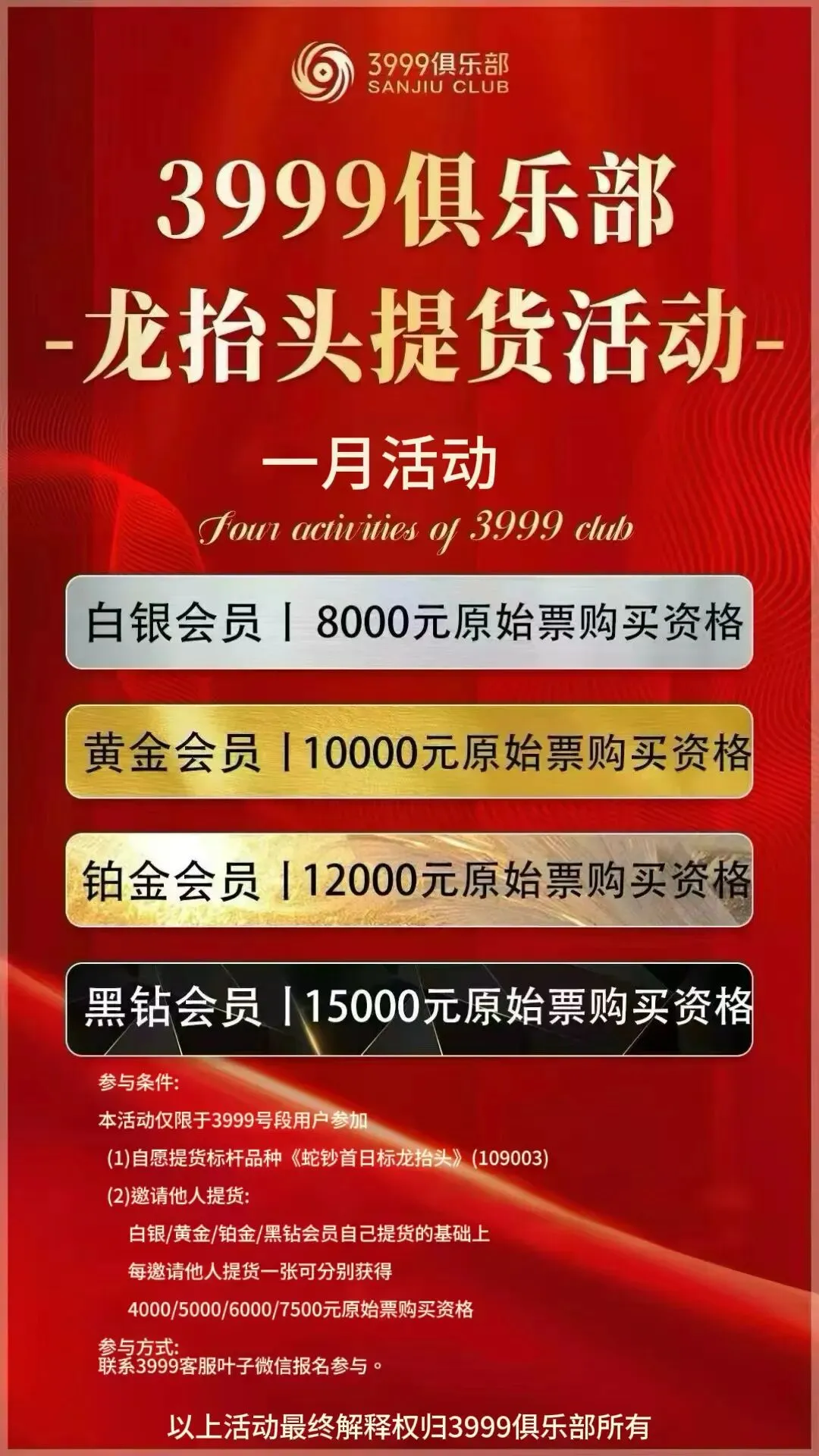 📢仅限 3999 号段用户!✅提货《蛇钞首日标龙抬头》,不同会员享对应原始票购买资格(白银 8000 起)✅邀人提货还能叠加额度!