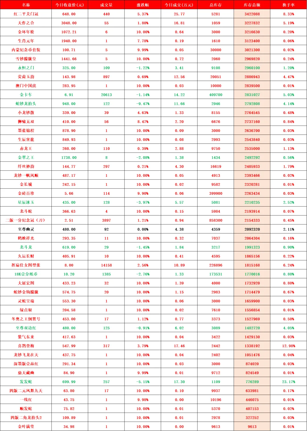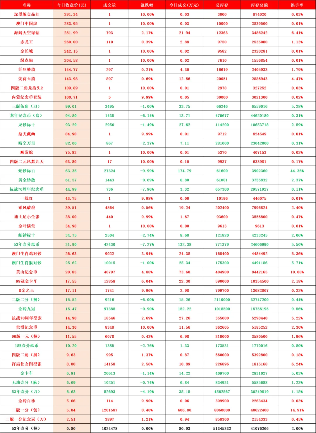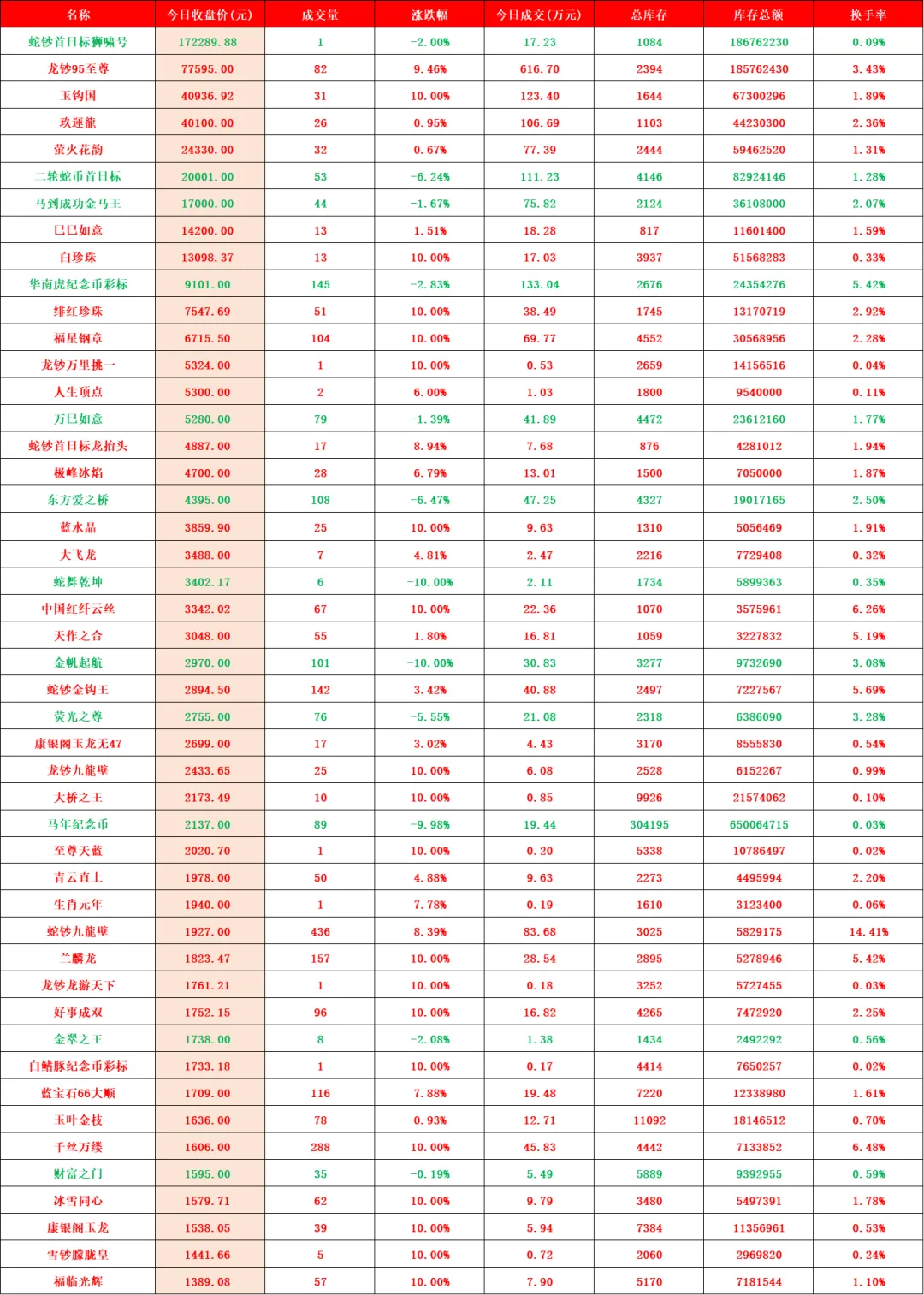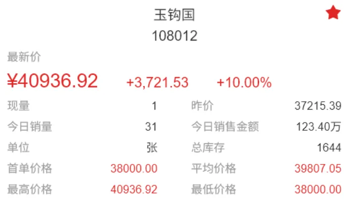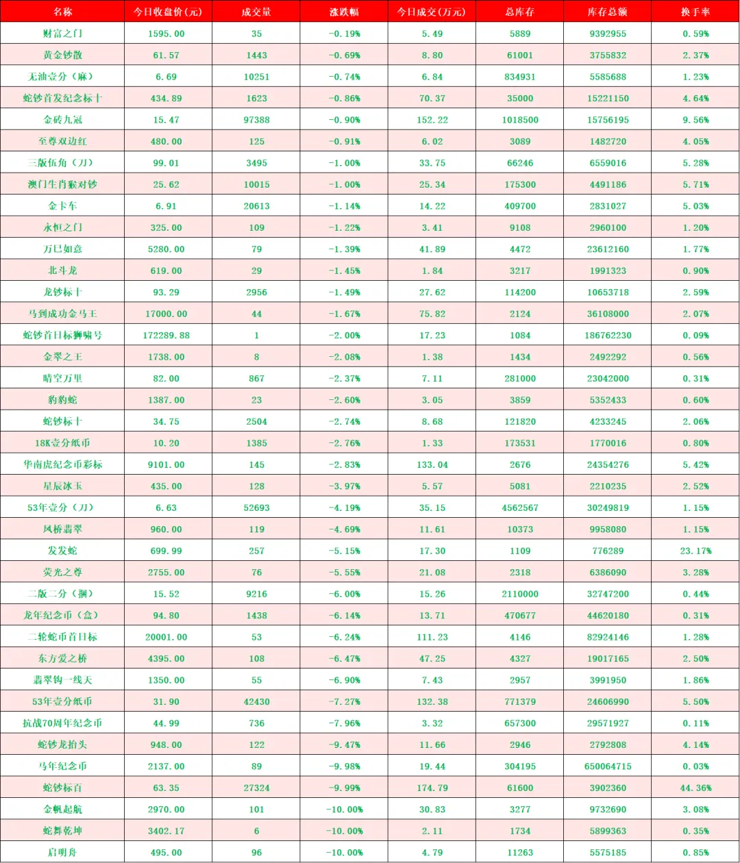 2026年首个交易日,迎来开门红,大桥之王、玉钩国、白珍珠、开元宝钞等品种继续强势涨停,带动人气品种继续向上突破。行情延续近期强势走势,稳步推高。比特龙银币、四版二角龙抬头2、四版二元凤舞九天、金叶满堂四家新品种上架。甄选品种增加至139家,上涨98家(其中涨停59家),平盘2家,下跌39家(其中跌停4家),市场规模因大市值回撤,略有收缩,达到24.05亿元。
