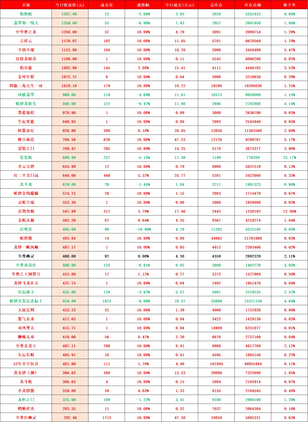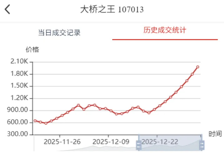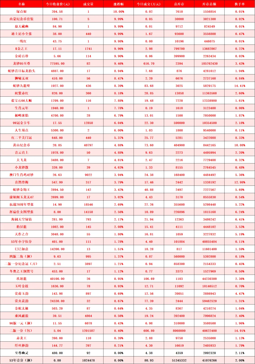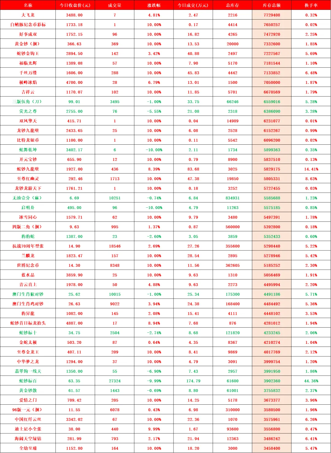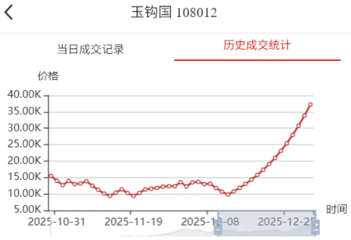 2026年首个交易日,迎来开门红,大桥之王、玉钩国、白珍珠、开元宝钞等品种继续强势涨停,带动人气品种继续向上突破。行情延续近期强势走势,稳步推高。比特龙银币、四版二角龙抬头2、四版二元凤舞九天、金叶满堂四家新品种上架。甄选品种增加至139家,上涨98家(其中涨停59家),平盘2家,下跌39家(其中跌停4家),市场规模因大市值回撤,略有收缩,达到24.05亿元。