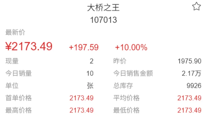 大桥之王,10连板,一字板涨停,封单强势,价格统一,缩量惜售,有机会继续连板。