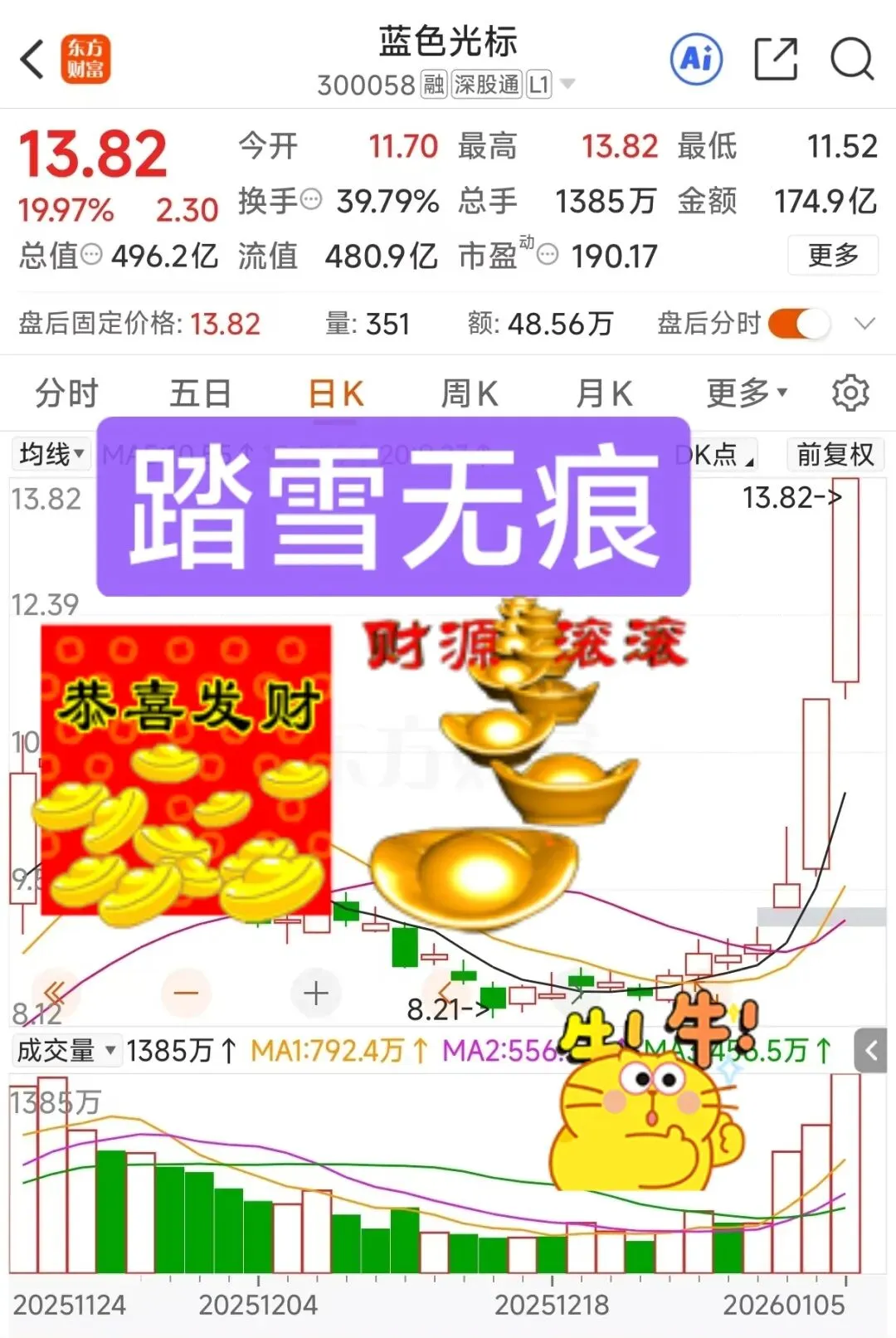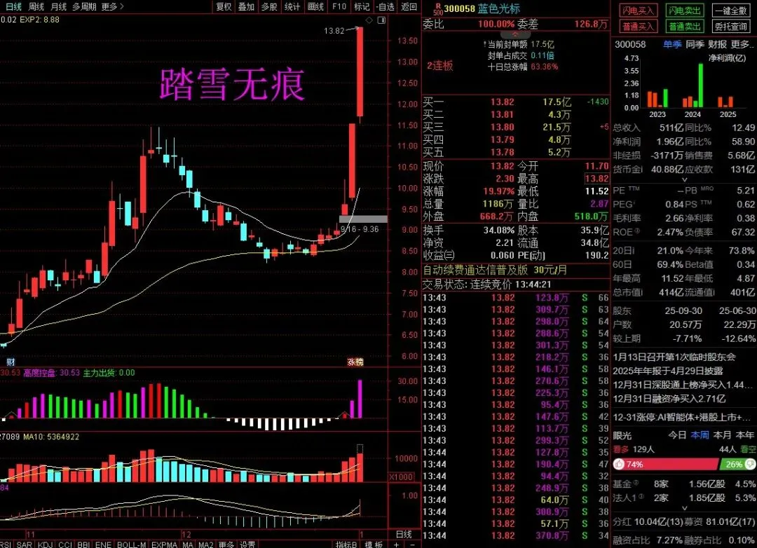 - AI营销爆发:BlueAI+AI智能体落地,前三季度AI驱动收入24.7亿元、同比增310%,占比近20%;与豆包大模型深度合作,接入字节视频生成能力,效率提升、成本下降。春晚AI云伙伴火山引擎(字节旗下)带动相关AI营销订单预期,字节33亿授信+合作加速,形成强预期。- 港股上市预期:12月30日更新H股招股书,募资投向AI研发与出海,拓宽融资+提升国际影响力,强化“AI+全球化”战略,吸引资金关注 。- 资金合力:龙虎榜显示机构净买1.86亿、北向净买1.56亿,提供中长线支撑;开源西安西大街净买2.03亿,游资虽有分歧但承接力强,高位换手充分(39.79%),量能(174.91亿)放大强化趋势。- 基本面改善:2025年三季度归母净利同比增58.9%,扣非增85.53%,经营性现金流改善60.52%;出海业务占比高,消费复苏带动营销需求,快手合作账期优化,业务扩张明确。- 题材与情绪:Meta收购AI应用公司带火AIGC/AI应用板块,蓝色光标作为AI营销龙头,叠加数字营销、出海等热点,成为资金抱团标的,短线情绪高涨 。关键信号