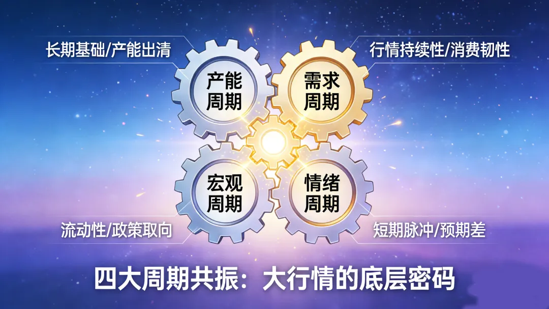 真正的大行情,往往具备一个特征:至少有两个以上周期,同时发生转向。理想状态是:产能周期见底;需求周期改善;宏观周期配合;情绪周期助推。