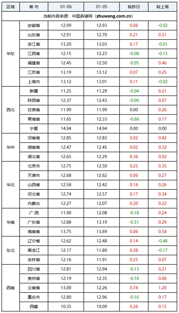 全国生猪价格整体呈现震荡维稳的态势。全国生猪平均价格约为每斤6.27元,与昨日基本持平。区域走势呈现“北强南弱”的格局,华北和东北地区由于养殖户惜售情绪较重、供应相对偏紧,价格出现全面上涨;而南方市场,特别是华南地区,因元旦节后消费提振作用回落,价格以下跌为主。此番走势主要受供需博弈影响。供应端,部分养殖户看好后市预期存在压栏情绪,但整体出栏压力尚可。需求端,元旦节日效应消退后,腌腊高峰已过,终端消费支撑略显不足。短期来看,猪价预计将继续震荡。随着春节临近,养殖端的出栏节奏与节前消费旺季的提振效果将成为影响未来猪价走势的关键因素。