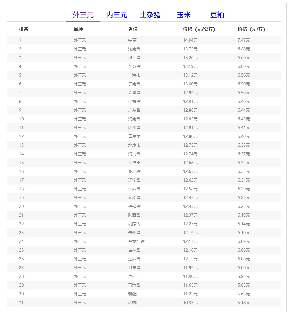 外三元排行前三:宁夏回族自治区14.94元/公斤、海南省13.75元/公斤、浙江省13.20元/公斤;