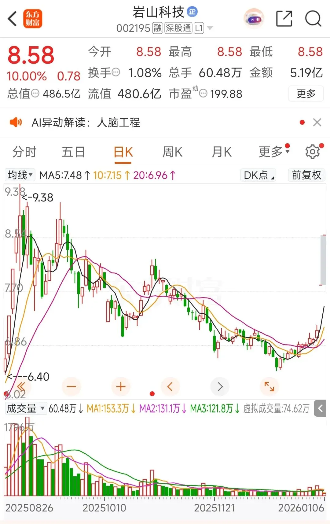 3、人脑工程:可以理解为马斯克概念股的补涨,也可以理解为ai应用的细分启动,但竞价开始各种一字抢筹,日内直接高潮有点类似于此前的海南单日表现,吃独食的板块持续性总是不好的。没有接力预期。