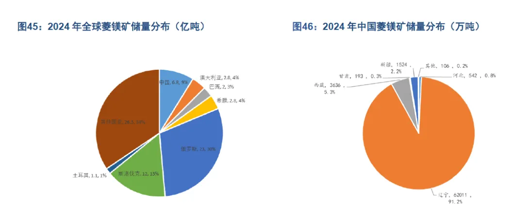 如需更多报告、获取矿产资源上下游客户资源,联系客服中国镁资源储量丰富,资源禀赋较高。中国可供采选冶炼的镁资源主要分布于菱镁矿、白云石矿与盐湖资源中。据国务院发展研究中心统计(2024年),中国镁资源储量占全球 70%。菱镁矿方面,根据 USGS 统计数据,2024年全球菱镁矿储量为77 亿吨,且集中度较高,CR3 达到 54%。其中,俄罗斯(23 亿吨,占比 30%),斯洛伐克(12亿吨,占比 15%)和中国(6.8亿吨,占比 9%)为全