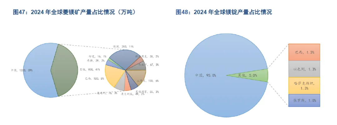 中国原镁产量占全球原镁产量已达 92%。从上游菱镁矿产量观察,根据 USGS 统计,2024 年全球菱镁矿产量合计 2200 万吨,较 23 年持平;其中中国菱镁矿产量为 1300 万吨,较 23 年持平,占全球菱镁矿产量比例达 59%。全球原镁产出的集中度更高:根据中国有色金属工业协会统计,2024 年全球原镁产量为 112万吨,同比增长 12%;其中中国原镁产量+24.73%至 102.48 万吨,推动中国原镁全球产出占比从 23 年的 82%增长至 24年的 92%。此外,根据 USGS 统计,2019-2024年间,中国镁锭产量占全球镁锭比例年均数值为89%,至 2024 年该数值已升至95%。