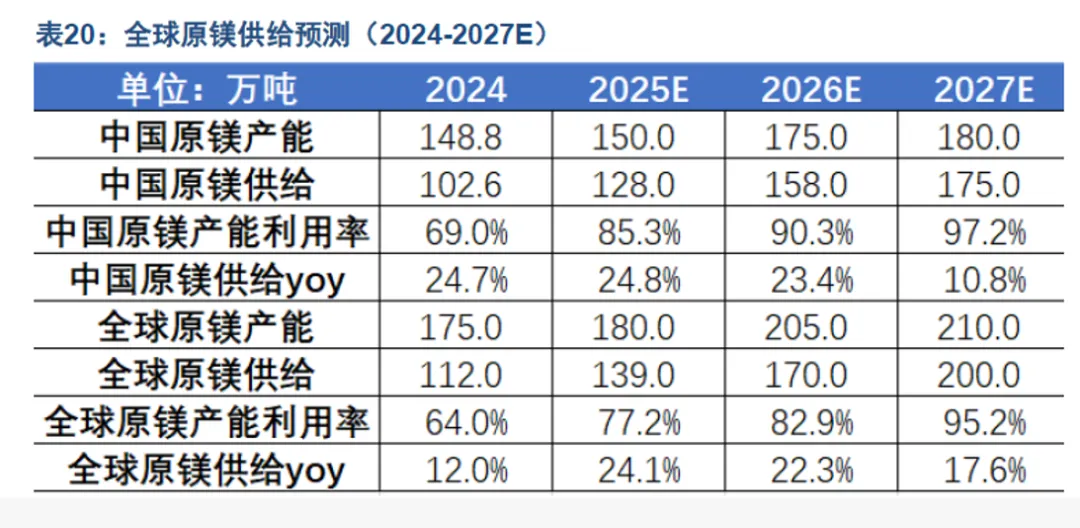 全球原镁行业产能利用率有望提升,行业规模或进入良性扩张态势。镁行业产业集群化发展有助于行业规模效益的提升及盈利水平的修复,也意味着行业的发展将与新能源产业的发展形成有效共振。考虑到镁金属作为绿色及新质生产力产业发展的核心生产要素,绿色化、智能化、移动化及轻量化在产品应用端的持续拓展将推动镁行业下游需求的有效扩张,这有助于改变行业产能利用率偏低的现状并且进一步提升行业规模进入良性扩张态势。从行业供需平衡角度观察,考虑到企业端原镁产能现有的建设规划与产能利用率的回升,我们认为 2024-2027 年间,全球原镁产量或由 112万吨增至 200 万吨,其中中国原镁产量或由 102.6万吨增至 175 万吨。结合我们下一篇文章对镁需求的讨论与预测,我们认为 2025-2027 年间,全球原镁供需缺口