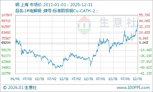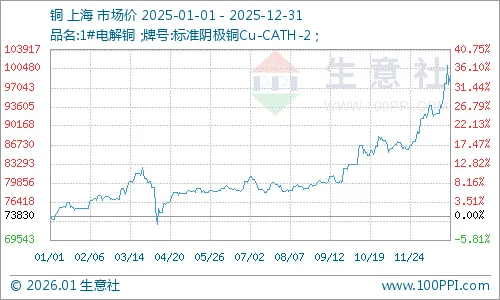 据生意社数据显示,2025年,现货铜价呈震荡上扬走势,年初报价73830元/吨,年末上涨至99180元/吨,全年上涨34.34%,全年最高价突破十万大关(12月29日的101053.33元/吨),也是2011年以来近15年的最高价,低点在4月8日的73618.33元/吨,最大振幅37.27%。