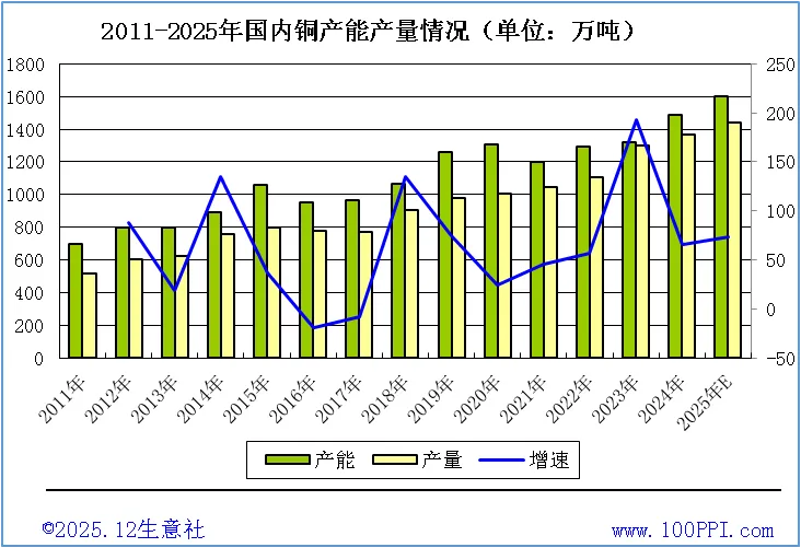 2011-2025年国内铜产能产量情况