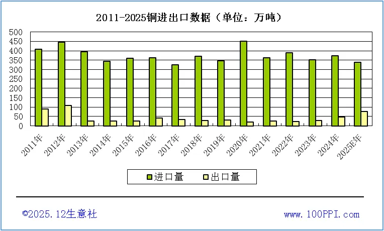 较2024年,2025年铜进口量减少,出口量增加。据海关数据显示,铜进口量远大于铜出口量,中国精炼铜2025年1-11月累计进口310.31万吨,同比减少8.27%;2025年1-11月累计出口69.85万吨,同比增加58.46%。