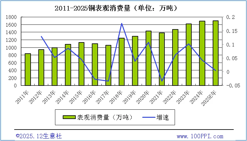 如上图所示,从生意社统计的近几年国内铜表观消费量来看,2021年以来,铜表观消费量逐年增加,近两年增速有所放缓。据数据统计,2025年,表观消费量1700.42万吨,2025年全年表观消费量与2024年相当。