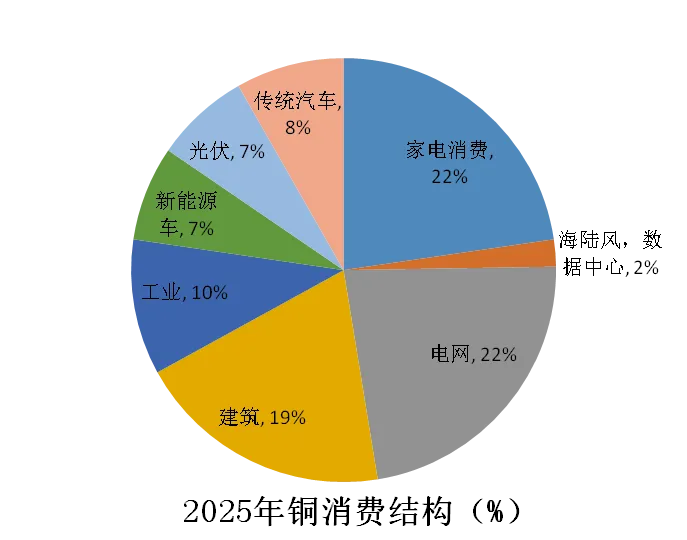 铜的需求结构正在发生新旧动能切换,以新能源、数字经济及人工智能为代表的新兴领域增长迅速,新产业发展增量带动铜消费需求增加。新能源汽车、风电及光伏新增装机、数据中心用铜从2021年的占比6.8%跃升至19.4%,正在成为铜需求增长的重要支撑。