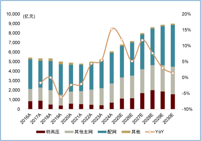 “十五五”期间全国电网工程投资额年均增速有望达5%以上。在众多“沙戈荒”风光大基地建设快速推进以及水电外送需求的持续增加下,特高压建设或将在未来几年保持高强度推进力度。同时,电网的智能化升级改造也将不断加码。