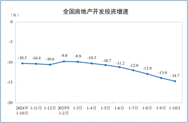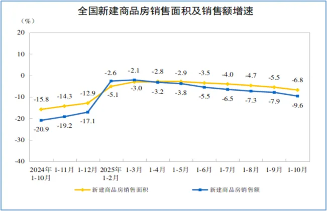 2025年1-10月份,新建商品房销售面积71982万平方米,同比下降6.8%;其中住宅销售面积下降7.0%。新建商品房销售额69017亿元,下降9.6%;其中住宅销售额下降9.4%。1-10月份,房地产开发企业房屋施工面积652939万平方米,同比下降9.4%。其中,住宅施工面积455253万平方米,下降9.7%。房屋新开工面积49061万平方米,下降19.8%。其中,住宅新开工面积35952万平方米,下降19.3%。房屋竣工面积34861万平方米,下降16.9%。其中,住宅竣工面积24866万平方米,下降18.9%。