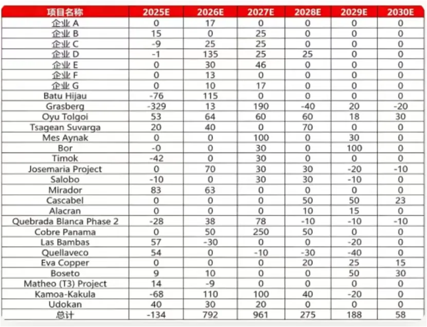 全球铜矿干扰事件频发,阻碍铜矿正常开采,铜矿产量增长受限。2025年以来,全球铜矿供应端干扰率陡增,矿山事故频发,经常性的生产中断和暂停导致年内铜矿产量预期不断下修,原本预期的52万吨铜矿增量没有如期兑现;减量明显的项目有印度尼西亚Grasberg、刚果金Kamoa-Kakula、智利El Teniente、智利QB矿;预计2025年全球铜矿增1.5%至2332.4万金属吨。2026年,主放量矿山是巨龙二期、印尼Amman、秘鲁Antamina、厄瓜多尔MiadorPhasell、俄罗斯Udokan和Malmyzh,智利QB2等,总增量或在50万吨。