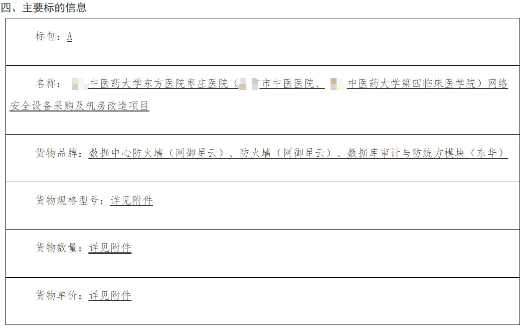 某中医药大学发布网络安全设备采购及机房改造项目结果公示,主要标的信息显示,网络星云产品(防火墙)、东华的产品(数据库审计和防统方)为主要的标的。