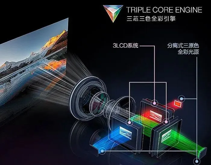 该技术基于其核心的3LCD技术升级,突破性地采用“三芯片+三色光源”架构,将红、绿、蓝三色LED或激光光源分别精准对准三片LCD面板。由于跳过了传统的单色光源分光环节,其零部件数量从29个精简至9个,光机体积缩减40%。