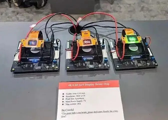 该样机采用三片主动发光的Micro LED光芯,每片分辨率达4K,像素尺寸仅为4微米,光学面尺寸仅0.69英寸。产品采用CMOS硅基驱动背板,在12英寸晶圆上制造,接口为标准1.8V CMOS电平,可广泛应用于各种微型化、高分辨率显示系统。