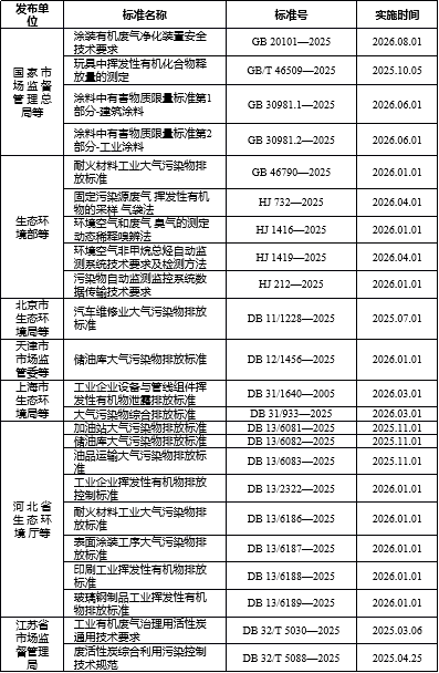 表1 2025年发布的涉及VOCs污染物的部分