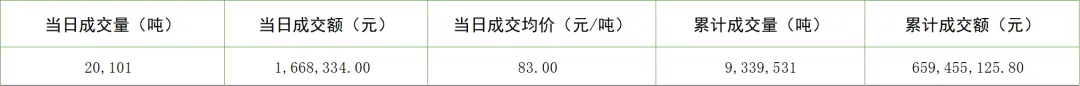 今日挂牌协议交易成交量5,316吨,成交额378,510.00元;大宗协议交易成交量100,000吨,成交额8,000,000.00元;今日无单向竞价。