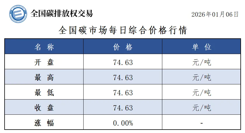 今日全国碳市场综合价格行情为: 开盘价74.63元/吨,最高价74.63元/吨,最低价74.63元/吨,收盘价74.63元/吨,收盘价与前一日持平。