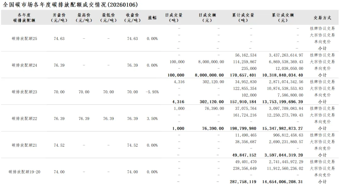 2026年1月1日至1月6日,全国碳市场碳排放配额成交量106,316吨,成交额8,454,900.00元。