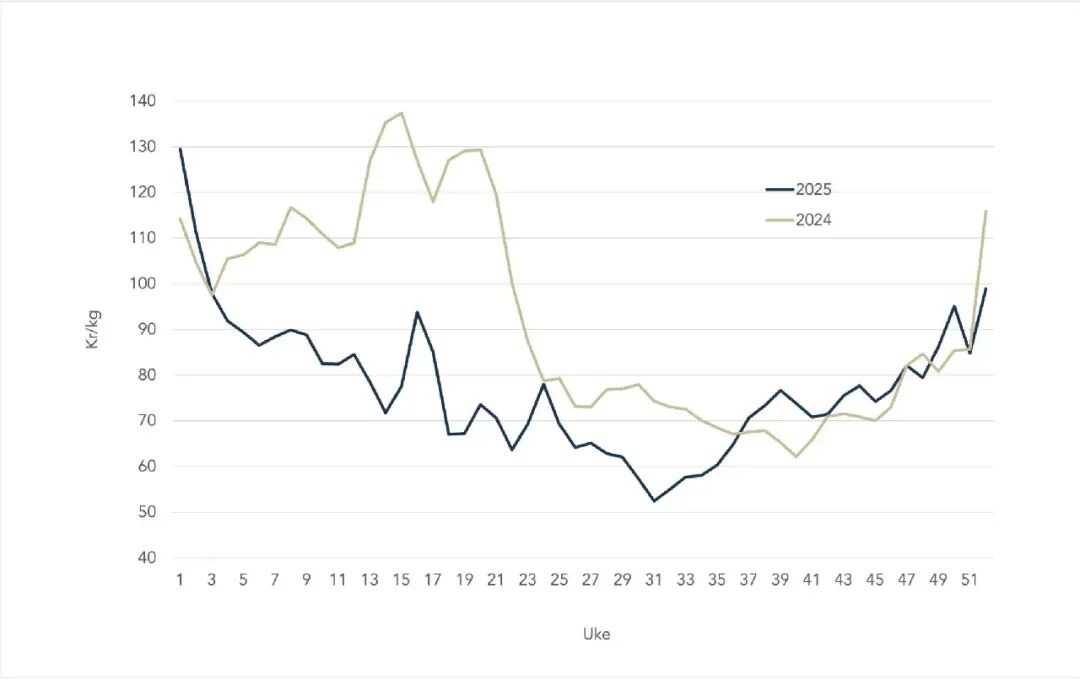 - 今年最低价格出现在第 31 周,为 52.42 挪威克朗/公斤。