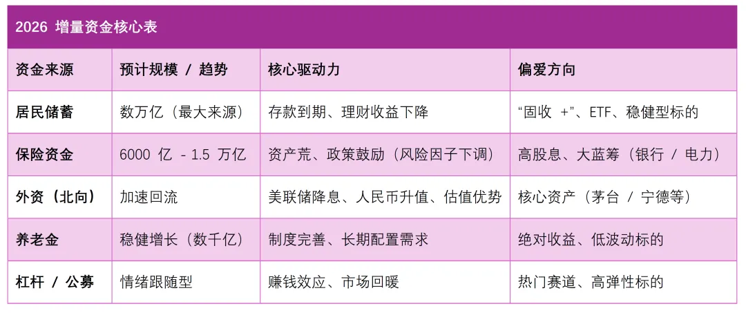 ✅ 保险资金:“资产荒” 逼出来的买家:险资负债端成本要 3%-3.3%,但债券收益率跌破 2%,买债根本覆盖不了成本!加上监管层下调险资炒股的风险因子(释放资本金),2026 年预计 6000 亿 - 1.5 万亿险资入市,专挑高股息、大蓝筹(比如银行、电力)下手