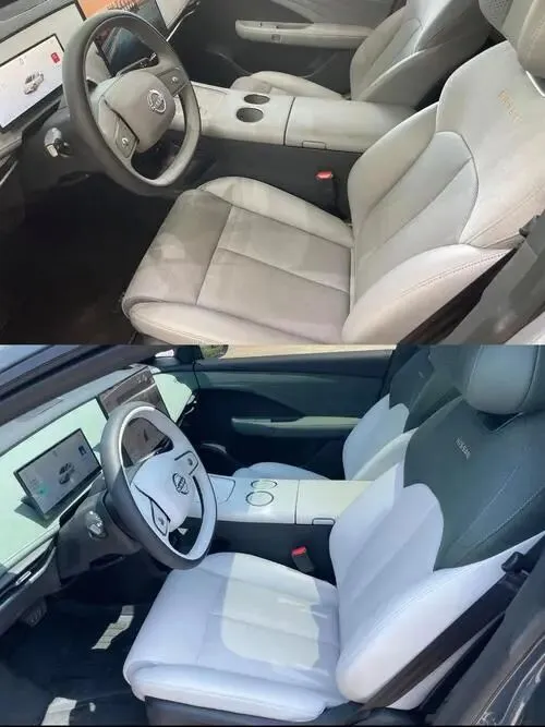 进到车里面,然后这个内饰啊,我得说,日产这次是真的下功夫了。你看这个中控台,这个用料,我用指甲敲一下,听到了吗?这个不是硬塑料,是软的,然后这个缝线也是真缝线,不是印上去的那种。这个在合资品牌的电车里面,从我个人来说,算是做得比较用心的了。