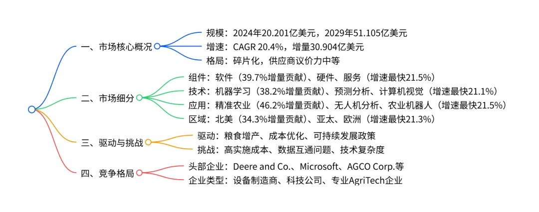 2024-2029 年全球农业 AI 市场将以20.4% 的 CAGR高速增长,从 2024 年的20.201 亿美元增至 2029 年的51.105 亿美元,增量规模达30.904 亿美元;市场呈碎片化竞争格局,北美为最大区域市场,软件是核心组件 segment,机器学习是主流技术,精准农业是主要应用领域,核心驱动因素包括粮食增产需求、成本优化及可持续发展压力,同时面临实施成本高、数据互通性不足等挑战。