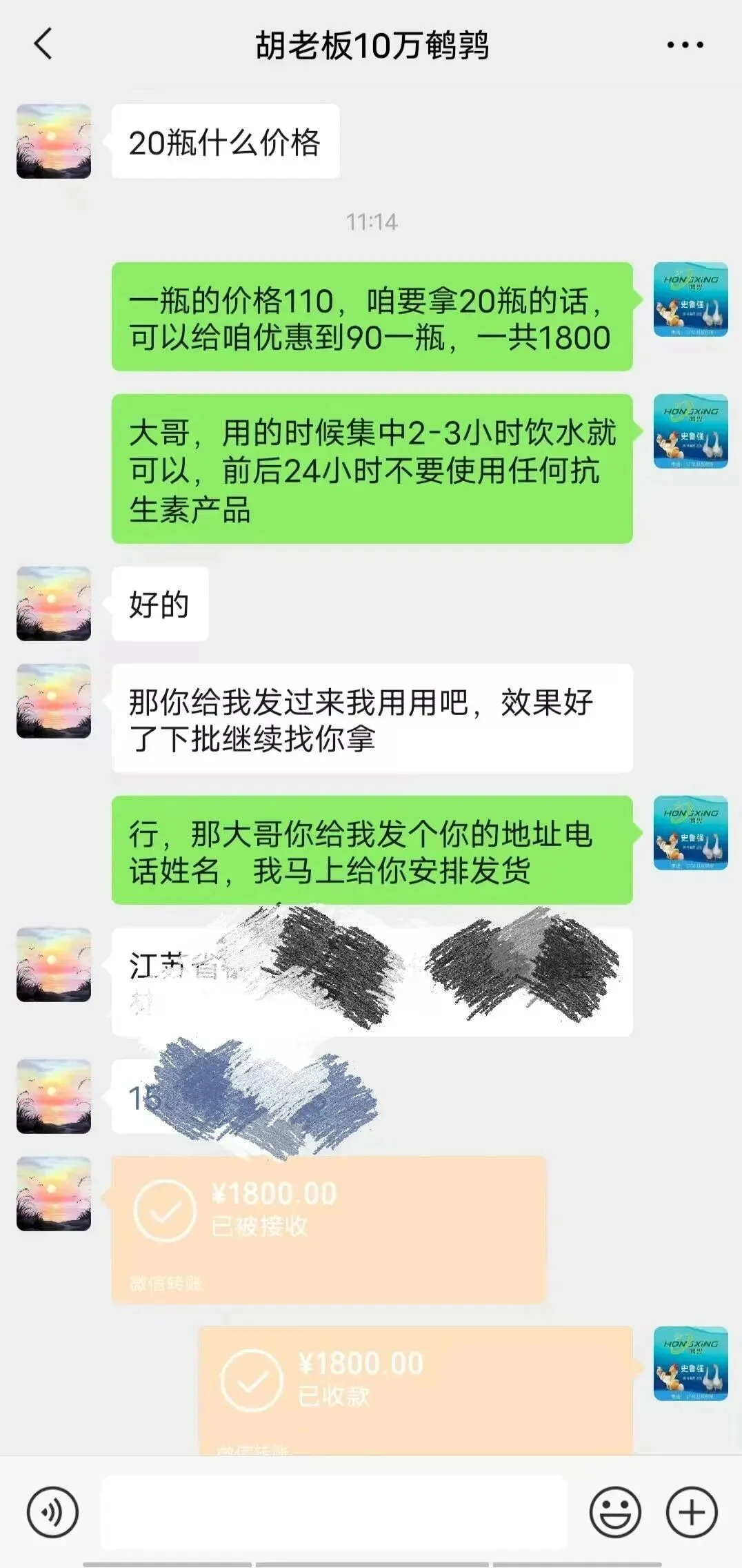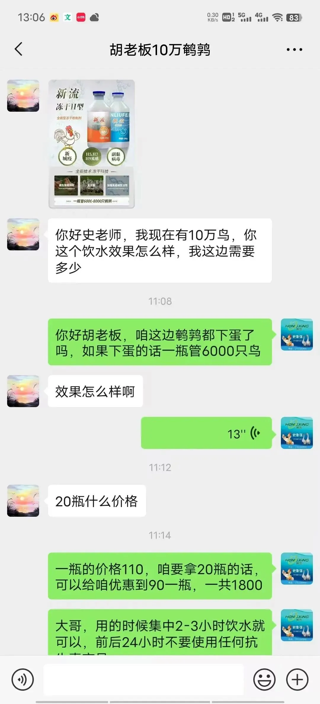 胡哥从微信上了解到饮水型疫苗【新流-冻干Ⅱ型】,直接饮水方便快捷,也是源于对史老师的信任,直接订购10万只鹌鹑的防疫饮水疫苗