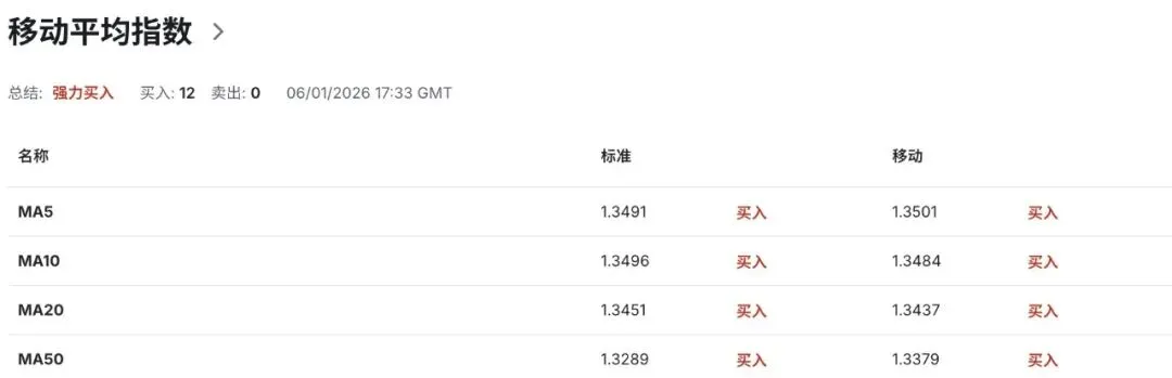 从4小时图指标分析,英镑兑美元虽自布林带上轨1.3560附近回落,但仍运行于中轨与上轨之间的偏强区域,表明短期多头格局尚未改变。布林带整体开口扩张,反映市场波动率处于较高水平。其中,中轨动态上移至1.3480附近,构成近期多空强弱分界线;下轨同步上探至1.3400区域,提供短线动态支撑参考。动量指标方面,14日相对强弱指数(RSI)自60-70的强势区间回落至53附近,显示短期上行动能有所减弱,市场情绪正由单边强势向多空平衡过渡。