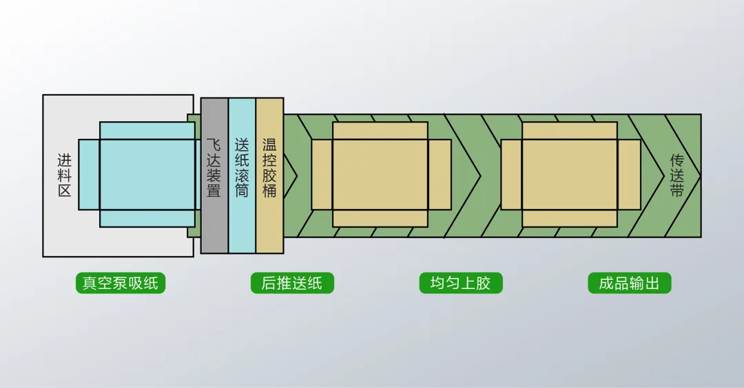 纸张经斜面输送平稳接触可调式胶辊,实现无刀痕、不起皱、厚薄一致的涂胶