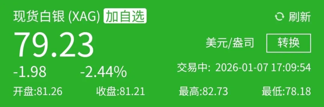 刚白银暂报79.23美元/盎司(相当17.85元/克),今日最高涨至82.73美元/盎司!