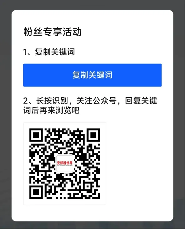 第一步:扫码后,先点击复制关键词,再扫码关注“变频器世界微信公众号”。