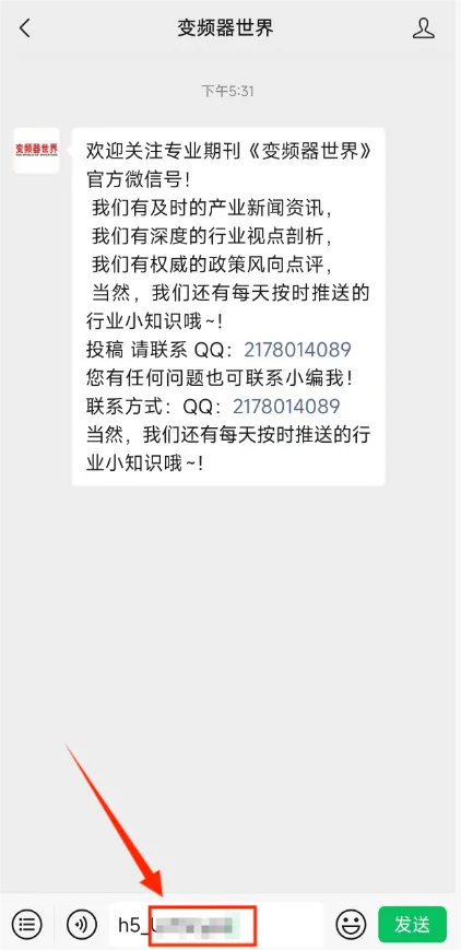 第二步:将复制的关键词发送至“变频器世界微信公众号”对话框。