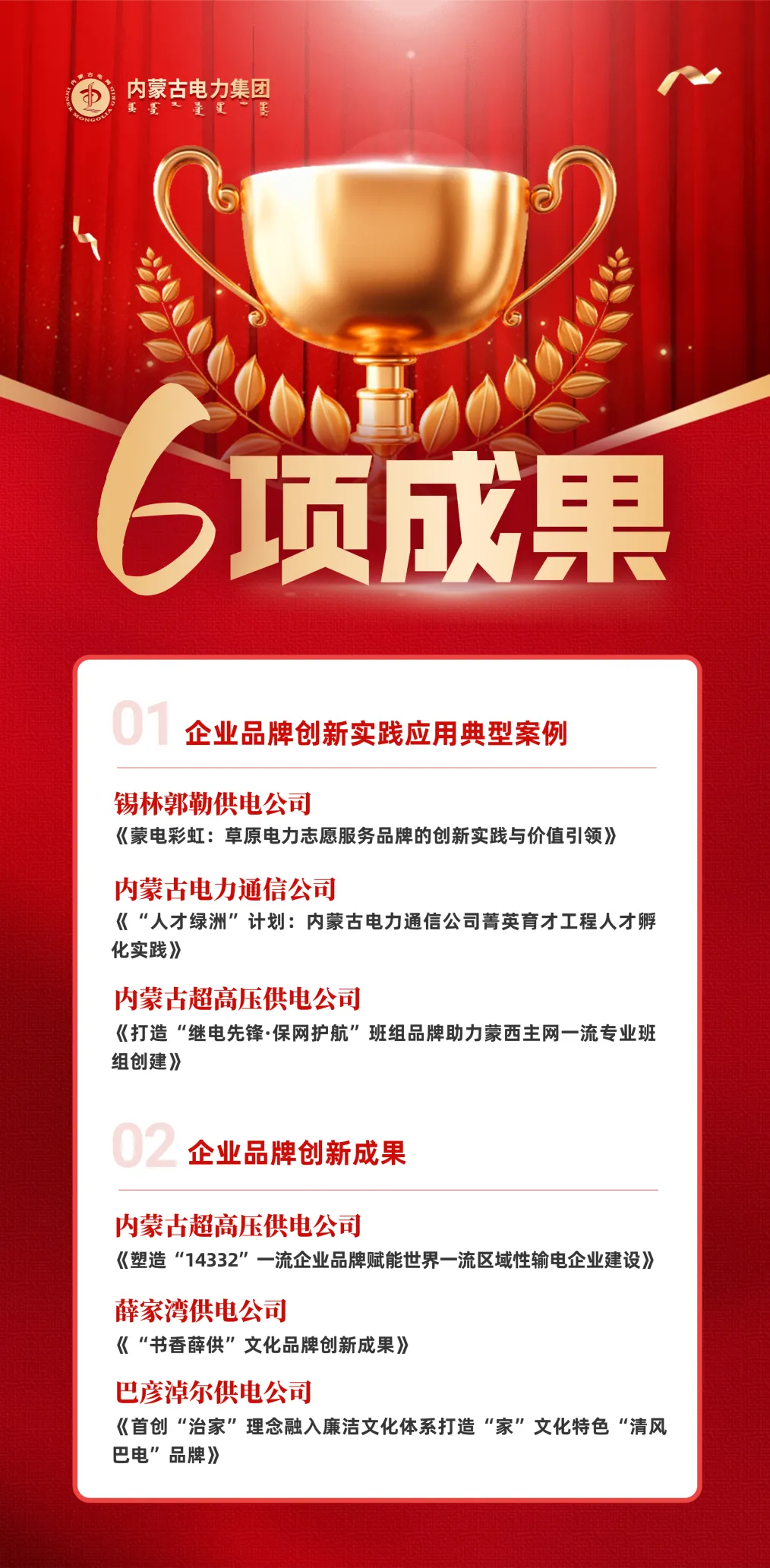 在本次活动中,集团推荐的6项成果从全国100余家电力企业的900余项成果中脱颖而出,其中:3项成果被评为电力行业品牌创新实践应用典型案例;3项成果被评为电力行业企业品牌创新成果。