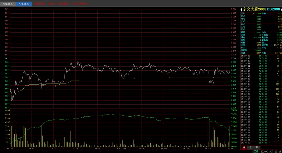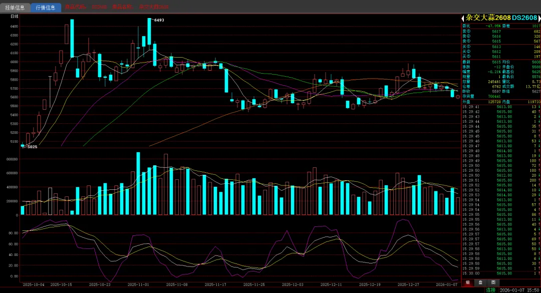 今日早上现货行情平稳微弱,相对昨天下午价格有所企稳,早盘大蒜2608合约略微低开5588价格,因未能继续形成有效破位,多方低位承接,盘面重新回升至5600上方,小幅下调并维持短期震荡逐渐企稳5600处。之后盘面维持在5610-5620区间窄幅震荡,中午收盘在5613价格。