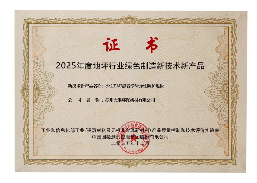 作为大乘环保核心创新成果之一,水性EAU®静音净味弹性防护地板早已凭借其硬核表现,赢得了业界的高度认可。它不仅获得江苏省工信厅“国际领先”的权威鉴定,更将多项重磅认证收入囊中。此次在行业高峰论坛上再度获奖,可谓实至名归!