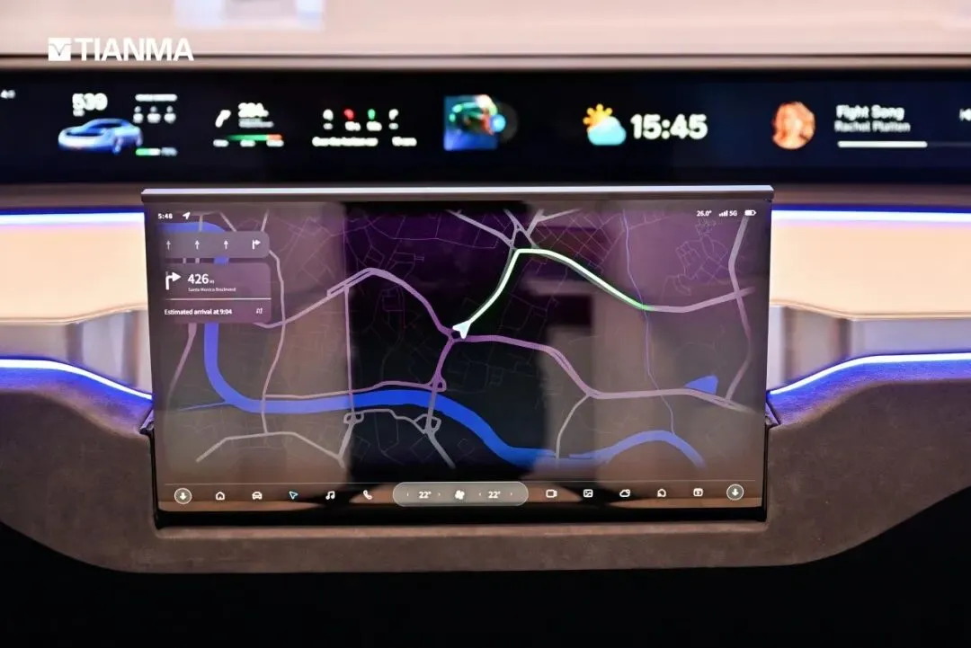 天马新一代智能座舱中,49.6英寸全景沉浸「天轩」屏作为座舱“信息中枢”,以1.25米C型超广曲面形态,实现仪表、中控、副驾与后视镜的一体化集成。搭配康宁先进冷弯盖板玻璃,R3000曲面无缝贴合挡风玻璃,形成安全交互;依托天马ACRUS精准像素级调光技术,超21万个独立调光单元,实现100,000:1的极致对比度,创新防倒影设计,还将挡风倒影亮度比例控制在0.55%以下,融合动态影像系统,为全天候驾驶提供安心防护。
