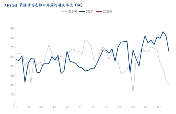 从基本面来看,主产地煤矿结束年底元旦假期检修之后,多数前期停产煤矿已在3号左右全面复产,产量基本恢复满产水平,但仍有部分受制于地质条件影响仍在停产煤矿预计要到春节假期结束后复产,1月产量环比12月预计回升,我网统计1月1日至5日有49座煤矿复产,涉及产能7505万吨。不过2026年产量高峰期预计将在3月实现。蒙煤方面,由于12月份未完成冲量任务,元旦前蒙煤通关持续高位,元旦假期之后,由于任务减轻及库容限制,通关车数明显下滑,目前甘其毛都通关车数已降至1100车左右。
