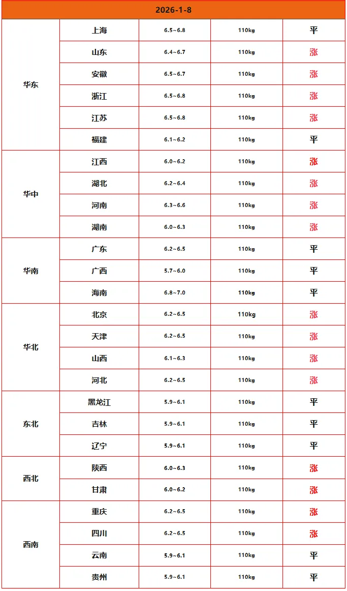 >2026年01月08日全国猪价行情表