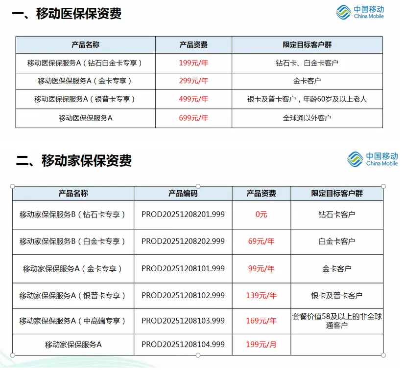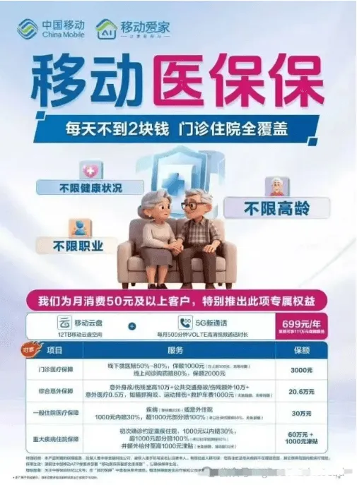 【声明:部分内容来源于网络,我们对作者深表歉意,如有侵权,请联系小编微信:yystt001处理,更新内容不易,十分感谢大家,希望大家能理解支持】据网友爆料:移动公司开始卖“保险了”!从提供的资料看,移动公司推出了一项名叫医保保的包含医疗保障服务的权益产品。产品资费面向不同的客户群体分为199元/年,299元/年,499元/年,699元/年。其中699元/年的产品包含:门诊医疗保障,线下就医赔50%-80%,保额1000元,线上问诊购药赔80%,保额2000元;综合意外保障,意外身故/伤残至高10万+公共交通身故/伤残额外10万+,意外医疗0.5万,如描抓狗咬、运动摔伤+救护车费1000元;一般住院医疗保障,疾病或意外往院1000元内赔30%,超1000元部分赔100%;重大疾病住院保障,初次确诊约定重疾住院,1000元以内赔30%,超1000元部分赔100%,并额外给付至高1000元津贴。(注:具体包含内容请以移动公司解释为准)移动公司跨界去销售保险,这实际上是行业发展的必然趋势。当下数字化革命正在重塑保险的价值链条,流量经营的思维正在朝着价值经营的思维进行转变。拥有庞大用户基础的通信运营商成为了保险生态融合的重要参与者。移动公司拥有好几亿的移动用户以及宽带用户,其遍布全国的营业厅网点还有线上的服务平台,能够让保险产品广泛地触达用户和便捷地进行服务,这是传统保险渠道无法具有的优势。此次移动公司推出的医保保产品,正是借助着它的场景以及数据优势,进行把保险服务嵌入日常通信消费场景的权益创新尝试。